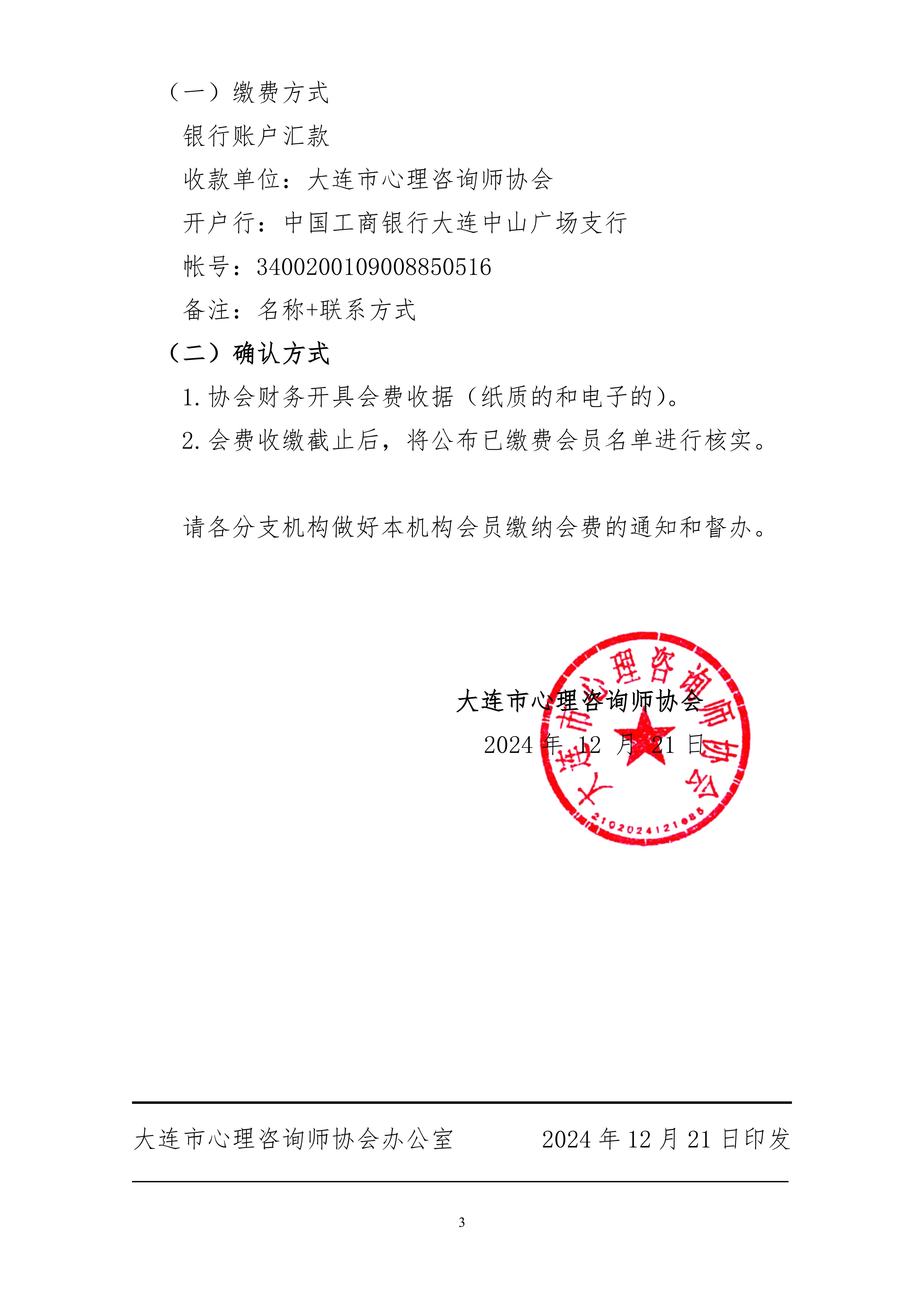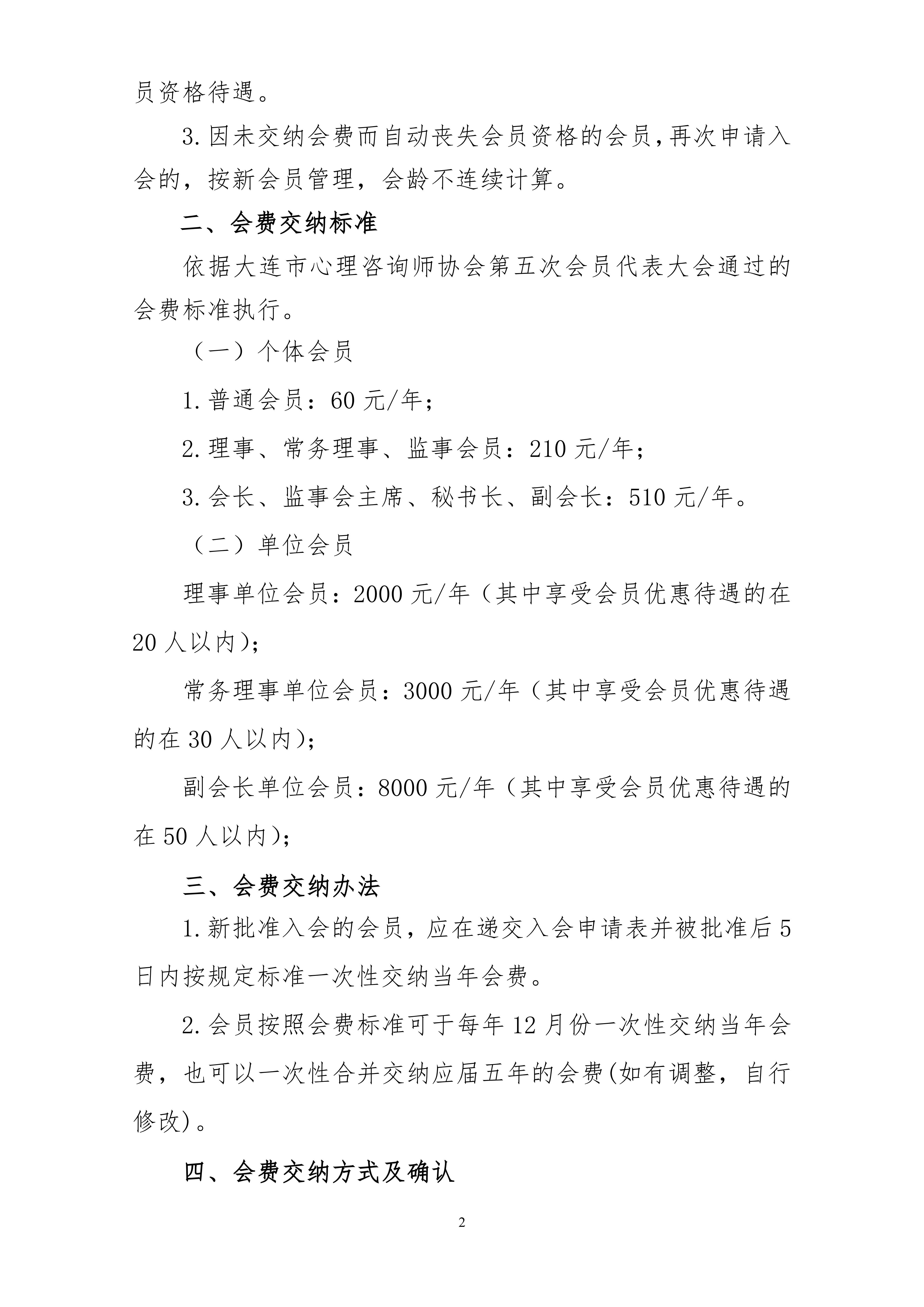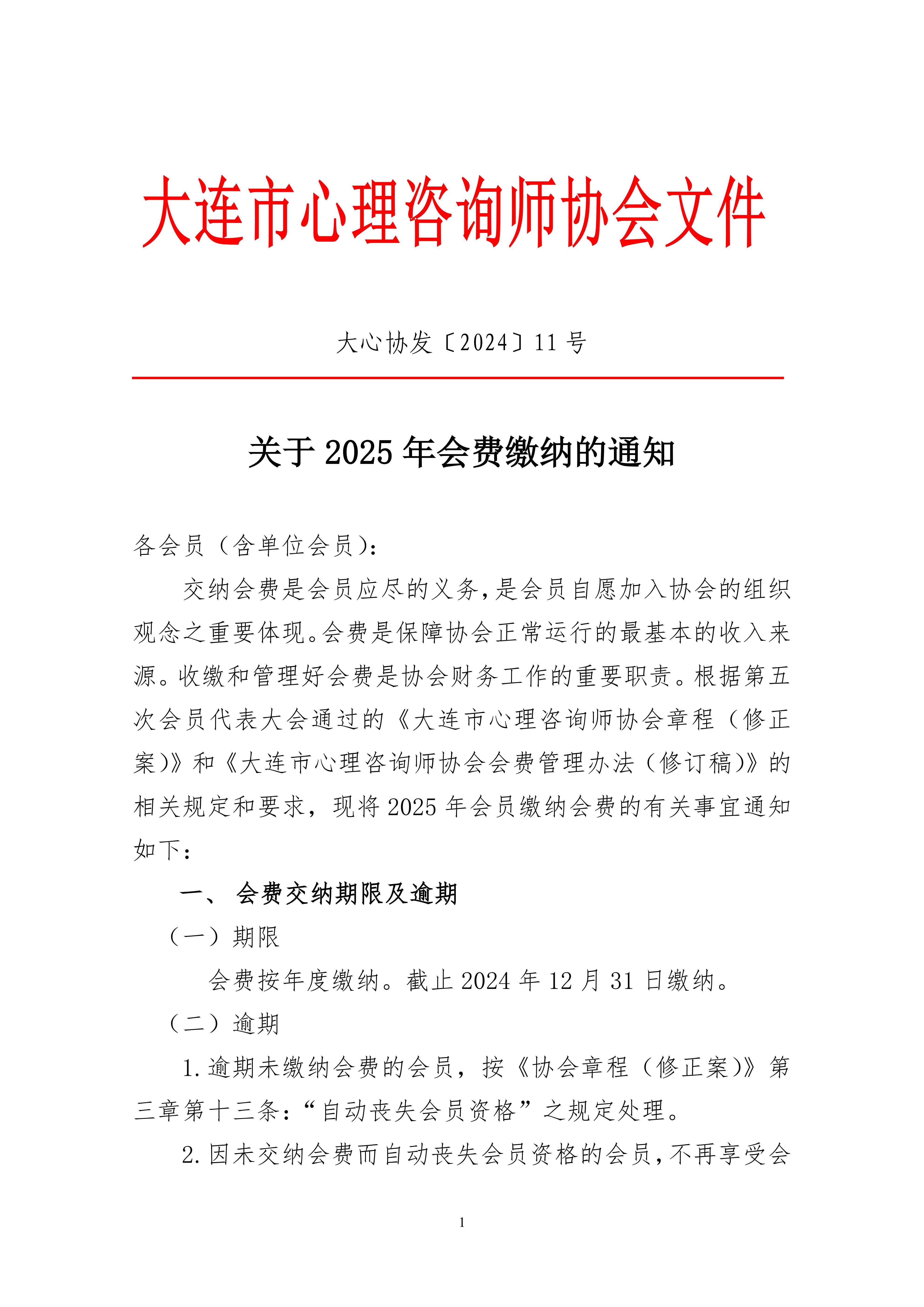 各会员(含单位会员):交纳会费是会员应尽的义务,是会员自愿加入协会的组织观念之重要体现。会费是保障协会正常运行的最基本的收入来源。收缴和管理好会费是协会财务工作的重要职责。根据第五次会员代表大会通过的《大连市心理咨询师协会章程(修正案)》和《大连市心理咨询师协会会费管理办法(修订稿)》的相关规定和要求,2025年会员缴纳会费的有关事宜通知。